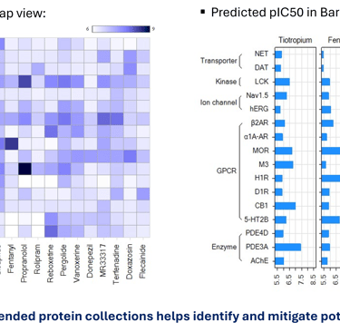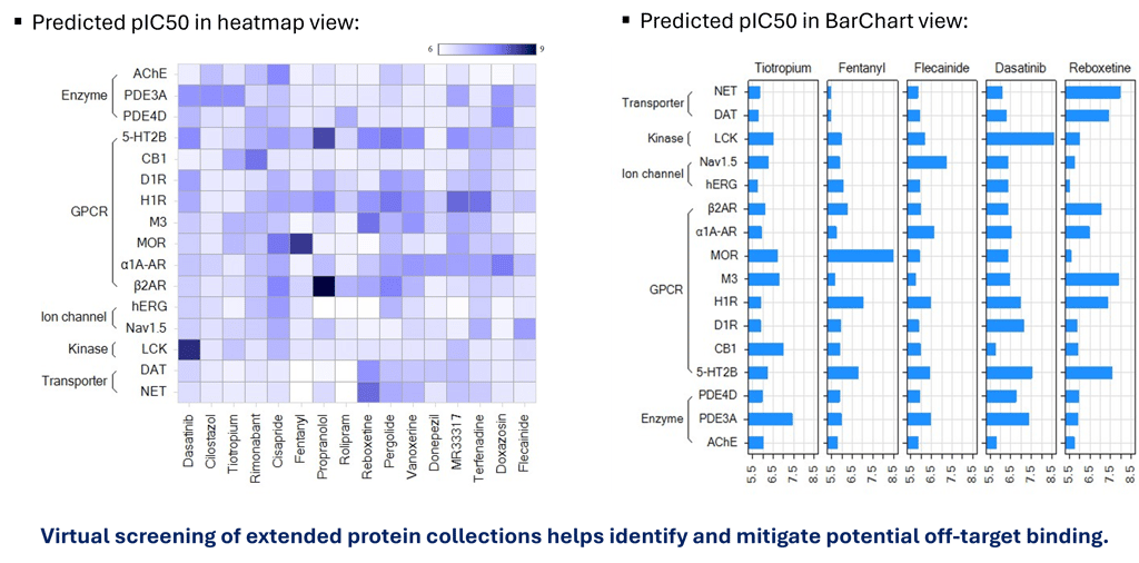 1.2. Secondary Pharmacology The same AI-based framework can be applied to secondary pharmacology by profiling compound binding across known safety panels or other target collections associated with safety concerns. This virtual screening approach helps detect cross-reactivity, binding promiscuity, and potential safety liabilities early in the discovery process. In this demo, the IQ Consortium’s early safety panel, including representative kinases, GPCRs, ion channels, and transporters, was virtually tested with known compounds using the same AI-based affinity prediction framework.