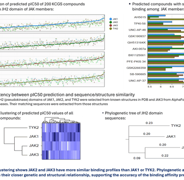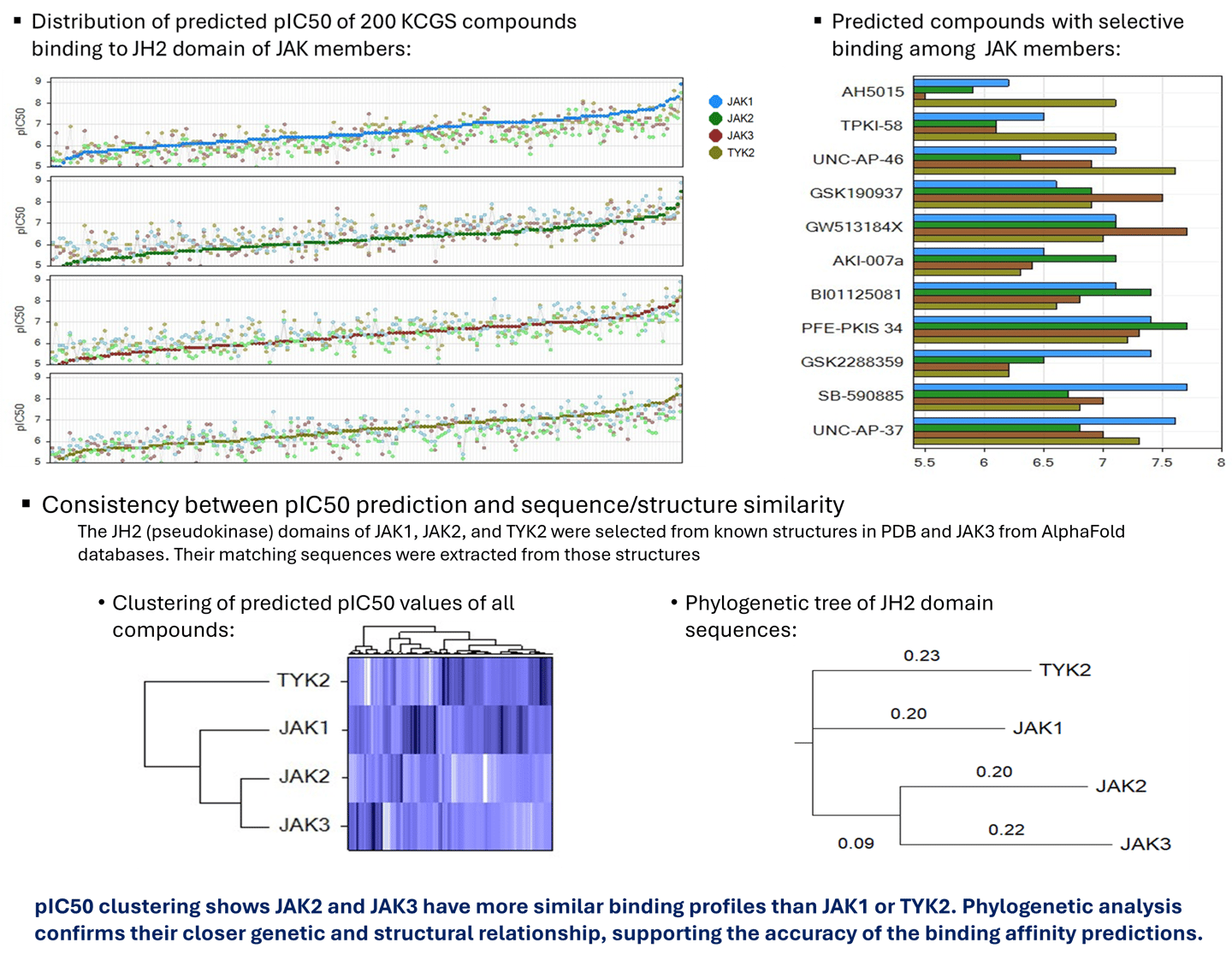 1.1. Hit Discovery. AI-enabled affinity prediction supports hit discovery by virtually searching compound libraries against individual protein targets to identify high-affinity binders, or across related target families to find selective chemotypes. These predictions enable ranking by potency and selectivity, grouping by scaffold similarity, and identifying unique binding modes that guide efficient lead selection prior to experimental validation. In this demo, the KCGS compound set was searched against the JH2 (pseudokinase) domains of JAK1, JAK2, JAK3, and TYK2 to identify high-affinity and selective binders. Each domain was curated and scored by an AI-augmented structure-based model, generating a compound–target affinity matrix for top binders and JAK-selective chemotypes.